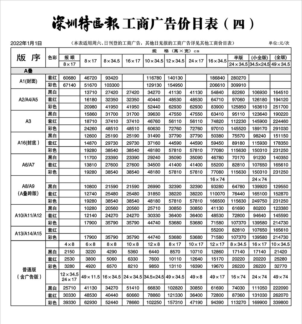 深圳特區(qū)報(bào)工商廣告價(jià)目表