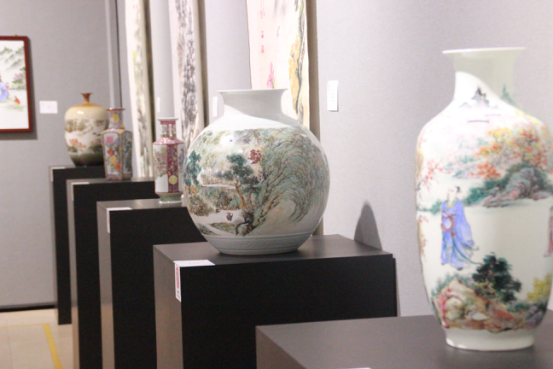 劉致遠(yuǎn)作為國畫、廣彩陶藝大師劉群興之子,也自幼隨父學(xué)習(xí)國畫及陶瓷制作,其廣彩作品色澤鮮明,絢麗多彩,既師吸收統(tǒng)繪畫技法,又仿造西洋畫法,頗具嶺南畫派折衷中西的精髓。其國畫松樹題材的創(chuàng)作,盡顯崇山峻嶺之中,松之勁峭與水之嫵媚,其繪制的山水題材彩瓷既有山河磅礴之態(tài)勢(shì)、又具匠心細(xì)刻之精致。此次兩位嶺南畫派傳承人在此展出他們的作品,內(nèi)容、風(fēng)格各異,交相輝映,很好地承傳了嶺南畫派的要義。