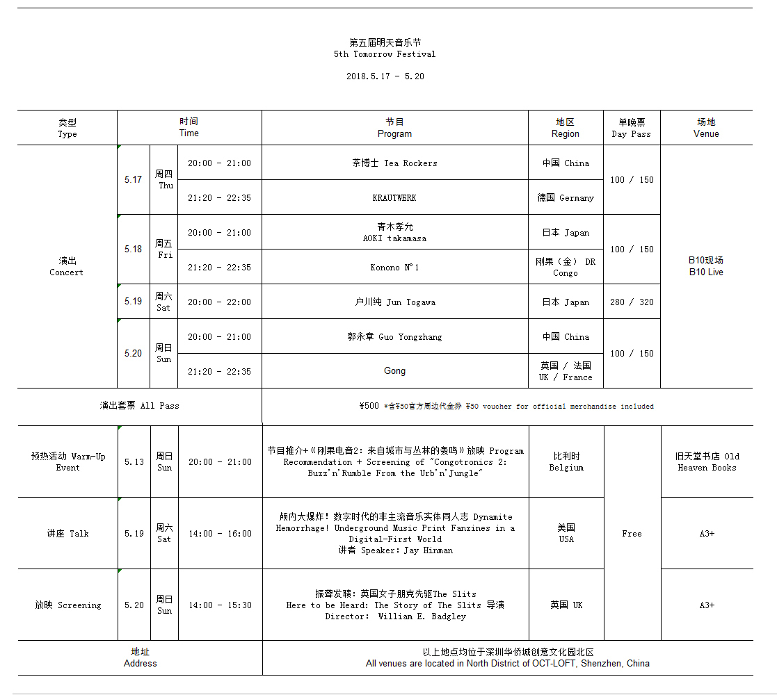 深圳新聞網(wǎng)訊 五月既至,好事即將發(fā)生。由深圳華僑城創(chuàng)意文化園主辦的第五屆明天音樂節(jié)將于2018年5月17日至20日在B10現(xiàn)場舉行。本屆明天音樂節(jié)作為“有形無界”華僑城創(chuàng)意文化園文博會分會場系列活動的重點(diǎn)項(xiàng)目,將邀請來自6個(gè)國家的7組音樂家/藝術(shù)家,呈現(xiàn)包括演出、講座、紀(jì)錄片放映在內(nèi)的多元節(jié)目。除此之外,策展人將于5月13日在舊天堂書店做節(jié)前預(yù)熱,屆時(shí)會有節(jié)目介紹環(huán)節(jié)和一場完整的放映活動。