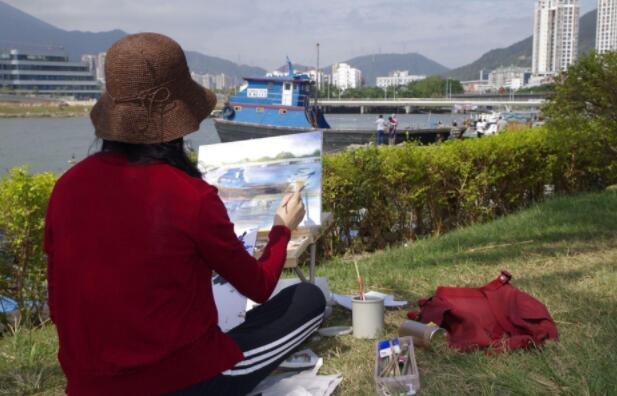 優(yōu)美的景色映入畫家們眼簾,點燃了他們的創(chuàng)作激情。來到鹽田之后,藝術(shù)家們紛紛找好寫生地點,擺好畫架,迅速進(jìn)入創(chuàng)作的狀態(tài)。他們當(dāng)中一部分來到了鹽田漁港,鹽田海鮮街后的小漁村避風(fēng)港。蔚藍(lán)的大海、旁邊的綠樹、避風(fēng)塘內(nèi)停泊的船只、白色的海鳥、釣魚的人以及遠(yuǎn)方火熱的建設(shè)場景都呈現(xiàn)在畫家的筆端;另一部分藝術(shù)家來到了位于三洲田深圳會計進(jìn)修學(xué)院的梧桐溪谷,小橋流水人家、奇石山林則一一被傾注于畫紙。