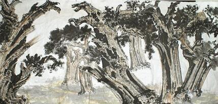 另一個他擅長的題材是古柏樹。1992年他去泰山采風途中。山上的古柏樹生機勃發(fā),堅韌不拔,給他帶來了一種震撼的力量。他當時就想將這些古柏入畫,為古柏注入精神意義。從此,在孔府、孔林、古蜀道以及陜西等地都留下他觀察古柏的足跡。有評論家認為,他的藝術(shù)作品不但在整體的構(gòu)圖上自然、清新和潤朗。而且在整體的布局上,疏密相間,虛實相融,用獨有藝術(shù)感覺構(gòu)建出了一個既蘊含了詩情畫意,又張揚了文化魅力和內(nèi)心情感的藝術(shù)空間。