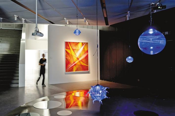 展覽中最吸引人的是互動藝術裝置,當代玻璃藝術家秦嶺帶來沉浸式視覺體驗裝置《光與云》,藝術家David Keohane的互動感應裝置《時空愛》,女性藝術家王帥,在現(xiàn)場進行的空間繪畫創(chuàng)作和沉浸式行為表演……這些豐富的表現(xiàn)形式讓觀眾體驗到視覺、聽覺的雙重演繹。