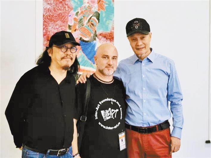 樊鴻賓(右)、鄒明(左)在畫展上與當地藝術家合影。(主辦方供圖)