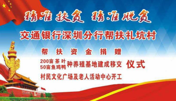自交通銀行深圳分行對(duì)口幫扶禮坑村,開展"雙精準(zhǔn)"扶貧以來,禮坑的經(jīng)濟(jì)社會(huì)發(fā)展和村容村貌發(fā)生顯著變化,積貧積弱的小山村呈現(xiàn)欣欣向榮的新氣象。積土成山、積水成淵,200畝茶山破土而出、蔚然成綠,50畝養(yǎng)殖基地竣工落成、生機(jī)勃勃,三萬(wàn)魚苗、數(shù)千雞苗茁壯生長(zhǎng),村民文化廣場(chǎng)、老年活動(dòng)中心、道路硬底項(xiàng)目、山村亮燈工程躍然紙上,逐次開工建設(shè),禮坑正創(chuàng)造并綻放新的希望,村民笑容淳厚,各級(jí)由衷點(diǎn)贊。紫金縣領(lǐng)導(dǎo)、縣扶貧工作總負(fù)責(zé)人廖振輝表示:"交通銀行深圳分行是真重視、真扶貧、扶真貧,在對(duì)口紫金的扶貧單位中首屈一指,無論在河源市的扶貧工作考評(píng)中,還是在代表河源參加的廣東省扶貧工作考評(píng)中,雙雙獲得優(yōu)秀評(píng)價(jià),真誠(chéng)感謝交行,紫金要和交行一起努力,讓禮坑成為社會(huì)主義新農(nóng)村示范村建設(shè)中的示范點(diǎn)"。