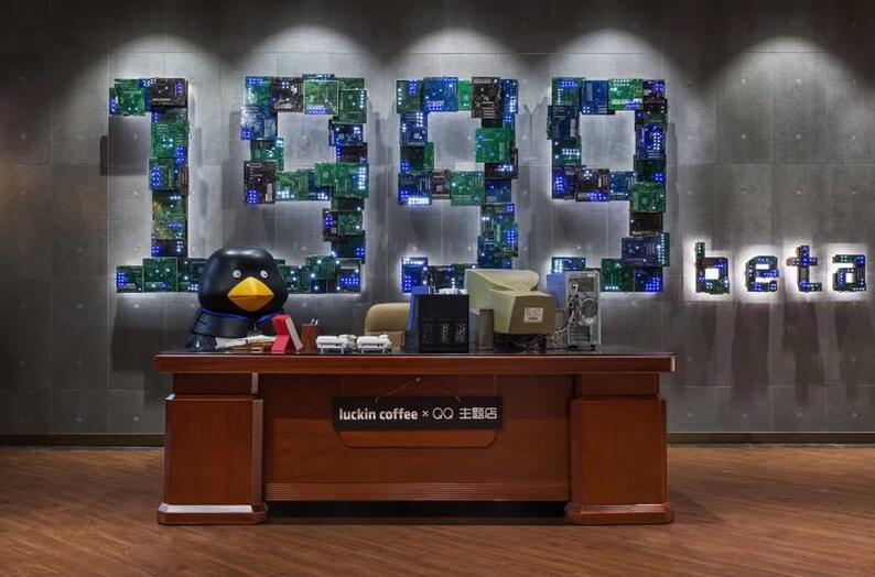 瑞幸咖啡騰訊QQ主題店距離騰訊全球總部所在地濱海大廈不到兩公里。咖啡店充滿互聯(lián)網(wǎng)懷舊特色,擺放著騰訊20年前創(chuàng)業(yè)伊始的第一張辦公桌復(fù)刻版,懷舊打卡的立柱上裝飾有充滿時代特色的QQ聊天對話框,在這里還可以聽到復(fù)古的QQ提示音。1999年,QQ beta版(測試版)上線,歷經(jīng)多次迭代目前月活用戶達(dá)8億,成為全球最大的通訊社交平臺之一。
