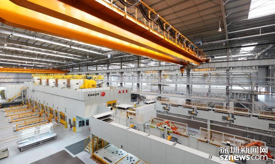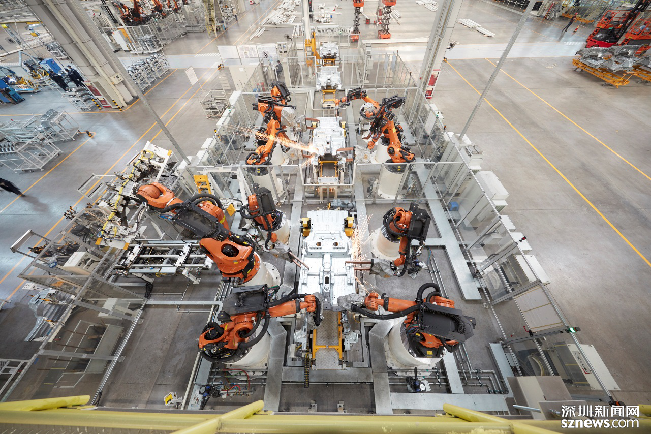 車身車間總占地面積9.9萬㎡,采用互聯(lián)機器人、柔性NC定位系統(tǒng)、柔性夾具切換系統(tǒng)、自動化輸送系統(tǒng),標(biāo)準(zhǔn)化工藝體系、三層環(huán)網(wǎng)智能管理系統(tǒng)、國際安全標(biāo)準(zhǔn),主線自動化率95%;采用柔性智能生產(chǎn)線,在同一條生產(chǎn)線可完成8個不同的車型無節(jié)拍損失自動切換和混線生產(chǎn)。