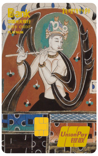 光大敦煌聯(lián)名信用卡卡面設(shè)計(jì)取材于敦煌壁畫,有敦煌大智文殊白金卡、敦煌天宮伎樂白金卡以及敦煌五百?gòu)?qiáng)盜成佛菁英白金卡三種信用卡。光大敦煌聯(lián)名信用卡的卡面設(shè)計(jì)靈感均來(lái)源于敦煌壁畫,大智文殊白金卡畫面為文殊菩薩結(jié)跏坐于青面獅虬首仙獅背上。文殊菩薩是專司智德、辯才第一的大菩薩,尊號(hào)“大智文殊”。天宮伎樂白金卡主體畫面為伎樂天,取材于莫高窟288窟,營(yíng)造了佛陀講經(jīng)說(shuō)法時(shí)佛國(guó)世界歡樂祥和的氛圍。五百?gòu)?qiáng)盜成佛菁英白金卡卡面設(shè)計(jì)取自“五百?gòu)?qiáng)盜成佛”的壁畫故事,佛用神通使被剜去雙眼的強(qiáng)盜重見光明,并對(duì)他們進(jìn)行點(diǎn)化,五百?gòu)?qiáng)盜潛心苦修終成五百羅漢。光大敦煌聯(lián)名信用卡的卡面設(shè)計(jì)將傳統(tǒng)文化融入現(xiàn)代金融產(chǎn)品,極具敦煌文化的風(fēng)格。