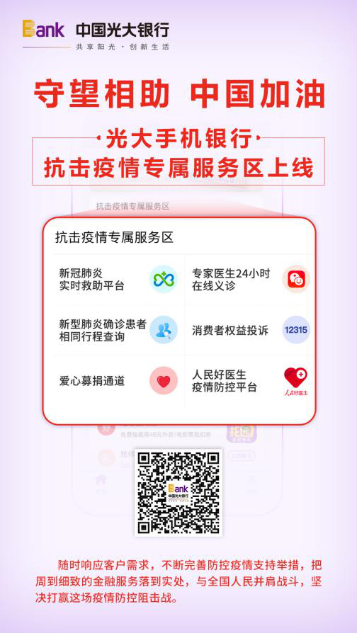 其中,專(zhuān)家醫(yī)生24小時(shí)在線義診是由光大銀行與平安好醫(yī)生APP合作推出,可在線免費(fèi)提供專(zhuān)家醫(yī)生義診服務(wù),并提供多類(lèi)常見(jiàn)藥物的購(gòu)買(mǎi)服務(wù);新冠肺炎實(shí)時(shí)救助平臺(tái)是由光大銀行與微醫(yī)互聯(lián)網(wǎng)總醫(yī)院聯(lián)合上線,平臺(tái)可提供最新疫情動(dòng)態(tài)、疫情防御、7*24小時(shí)在線免費(fèi)專(zhuān)業(yè)醫(yī)生咨詢(xún)等功能;愛(ài)心募捐通道提供多個(gè)渠道的賑災(zāi)捐款項(xiàng)目,讓愛(ài)心匯聚防控疫情斗爭(zhēng)第一線;人民好醫(yī)生疫情防控中央平臺(tái)第一時(shí)間科普權(quán)威知識(shí),公布疫情防護(hù)物資供需發(fā)布;確診患者相同行程查詢(xún)功能可為客戶(hù)提供火車(chē)車(chē)次、飛機(jī)航班號(hào)、城市等方式,查看是否有肺炎患者同行。