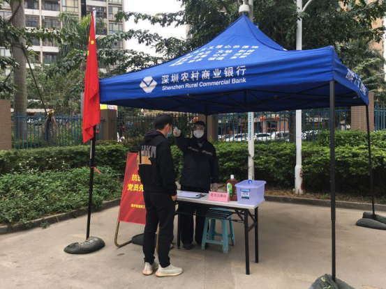 隨著疫情防控形勢的發(fā)展,深圳各街道各社區(qū)都不斷加強疫情防控,在道路口、社區(qū)出入口、樓棟出入口對進出車輛和人員進行篩查。在燕羅街道、松崗街道轄內(nèi)的道路卡口、社區(qū)門口、街道養(yǎng)老院、工廠等防疫檢查站點,記者看到很多印有深圳農(nóng)商行名稱的藍色帳篷。一頂頂帳篷就像一把把‘保護傘’,為防控工作人員提供了遮風擋雨的場所,也守護著轄區(qū)居民的健康。