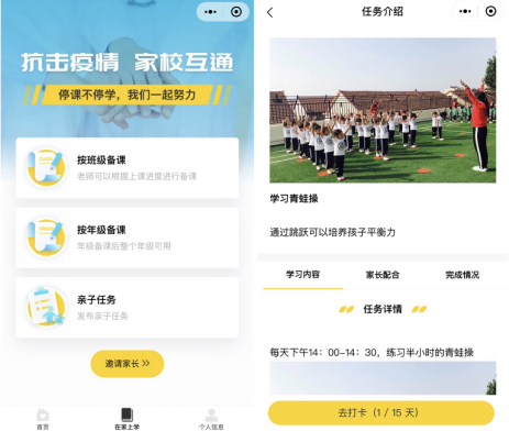 為此,“學(xué)子通”上線了“在家上學(xué)”功能,老師們可根據(jù)實際需要,選擇“按班級備課”或“按年級備課”,針對班級或年級將錄制好的備課內(nèi)容,如防疫小知識、親子閱讀、親子游戲等內(nèi)容上傳到“在家上學(xué)”模塊,讓孩子“宅”在家中也不停止學(xué)習(xí)的腳步。此外,老師還可通過設(shè)置親子小任務(wù),如一起做青蛙操、讀讀繪本小故事和親子手工藝等,讓家長和學(xué)生一起參與,并可設(shè)置打卡,調(diào)動起學(xué)生的學(xué)習(xí)興趣,既增加親子感情,又讓學(xué)生開展室內(nèi)鍛煉活動、開展課外閱讀,保持良好的身體狀態(tài),讓宅在家中的假期生活變得豐富。