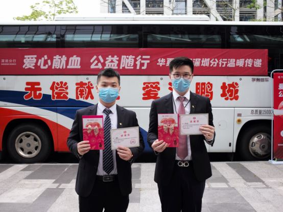 華夏銀行深圳分行行領(lǐng)導(dǎo)先后看望、慰問獻(xiàn)血員工。深圳市血液中心向華夏銀行深圳分行頒授感謝獎(jiǎng)牌,深圳分行孫海強(qiáng)副行長(zhǎng)代表分行向血液中心捐贈(zèng)1000只口罩。