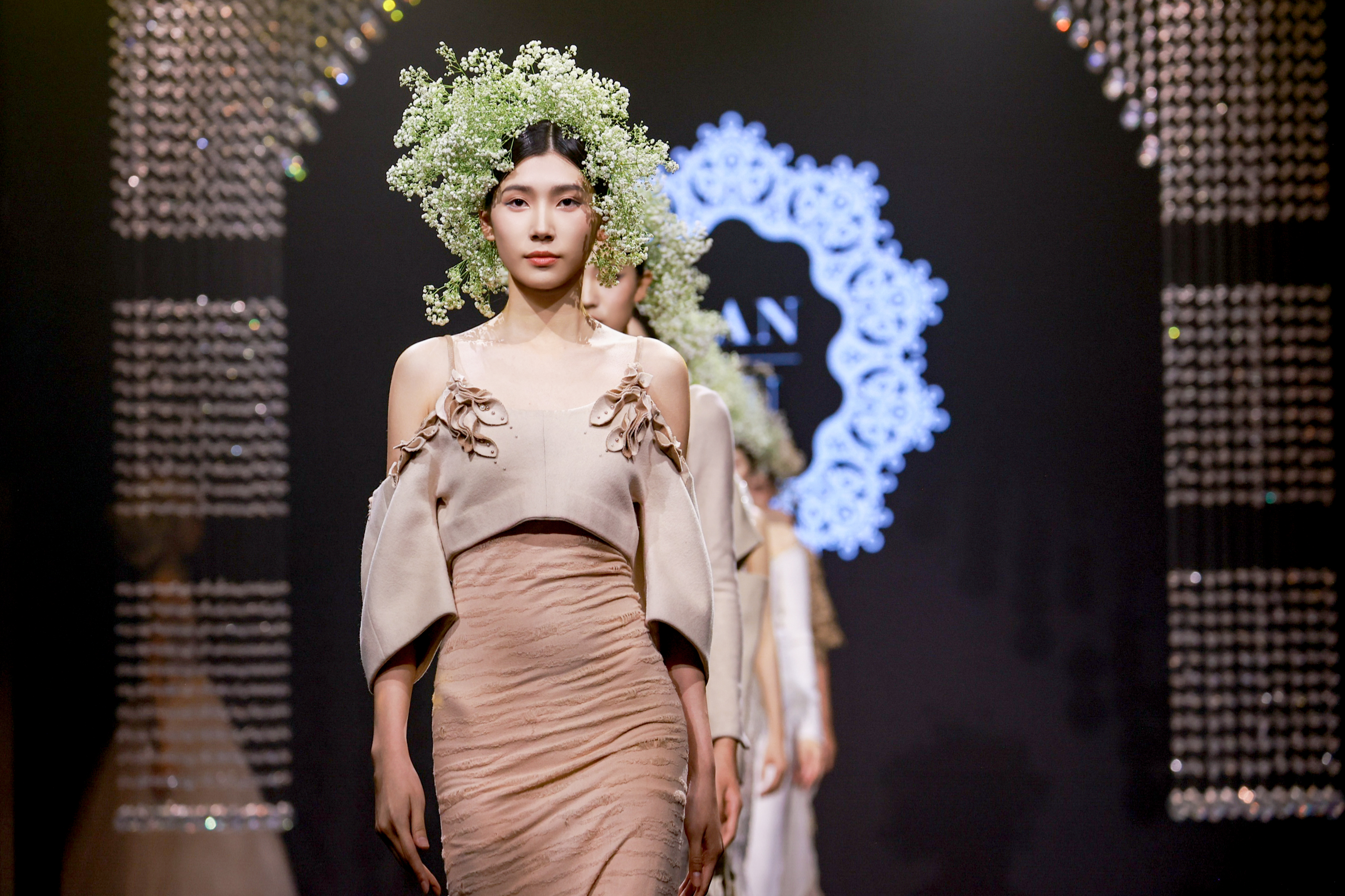 現場更有LANYU高定禮服展示,將中式美學意境與西式時尚剪裁完美融合,同時加重了蘇繡非遺元素的應用比例,將更多的非遺技藝融入服飾創(chuàng)作中,呈現出超高藝術水準。