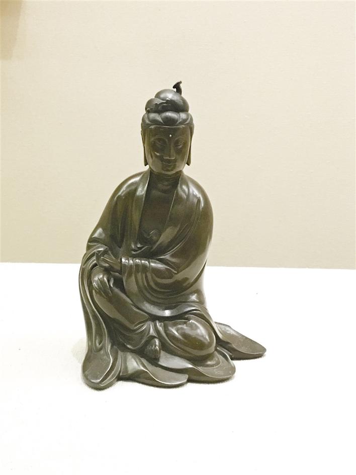 其中,最引人注目的莫過于展覽海報上呈現(xiàn)的“景德鎮(zhèn)白釉瓷塑觀音菩薩像”,產(chǎn)于南宋時期,整尊瓷塑構(gòu)思既簡約又精巧,以粗線條捏塑形體與衣紋,胸前瓔珞精致,人物形象傳神,充分展現(xiàn)了宋代瓷塑藝術(shù)的審美意韻與高超技藝。令人嘖嘖稱贊的還有明中晚期的“銅觀音菩薩像”。此像采用暹羅國(今泰國)所貢優(yōu)質(zhì)風(fēng)磨銅鑄造,工藝精細,撫之如嬰兒肌膚,嵌銀絲,背后銀絲鑲嵌方章銘款“石叟”二字,當(dāng)出自石叟本人之手。據(jù)了解,石叟為明代晚期鑄銅塑像名匠,僧人身份,現(xiàn)存中晚明觀音銅像中尚有部分“石叟”款,真品珍貴稀罕。