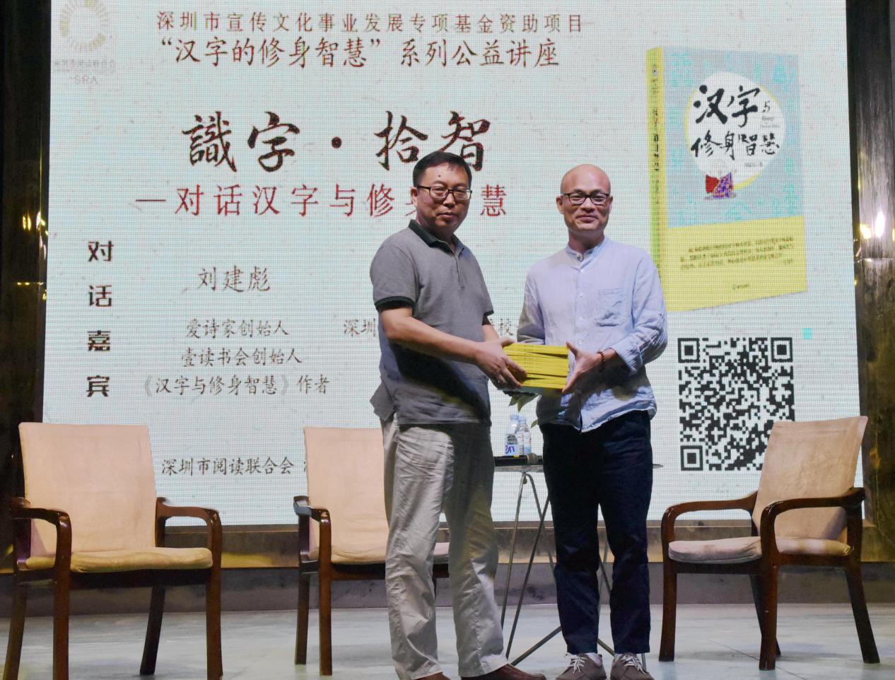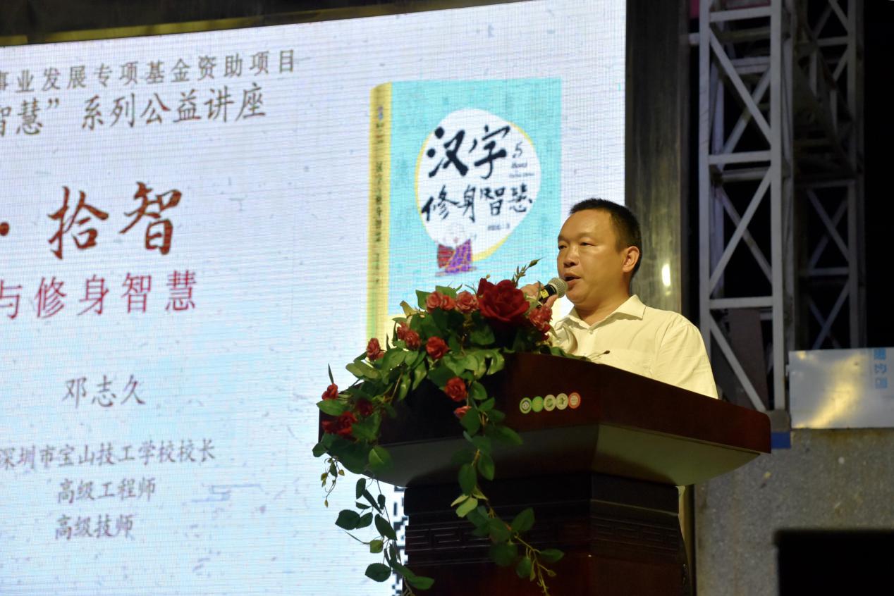 深圳新聞網(wǎng)訊 9月18日晚上7時(shí),由深圳市閱讀聯(lián)合會(huì)、深圳市壹書(shū)文化傳播有限責(zé)任公司和寶山讀書(shū)會(huì)共同主辦的“‘識(shí)字拾智’——對(duì)話漢字與修身智慧”公益文化講座在寶山技工學(xué)校寶山大舞臺(tái)拉開(kāi)了序幕。據(jù)悉,這是由深圳市宣傳文化事業(yè)發(fā)展專項(xiàng)基金資助項(xiàng)目“漢字的修身智慧”的第三場(chǎng)公益文化講座,以劉建彪《漢字與修身智慧》新書(shū)分享為契機(jī),傳播漢字正能量,讓更多的青少年識(shí)字長(zhǎng)智,領(lǐng)略漢字文化之精妙。