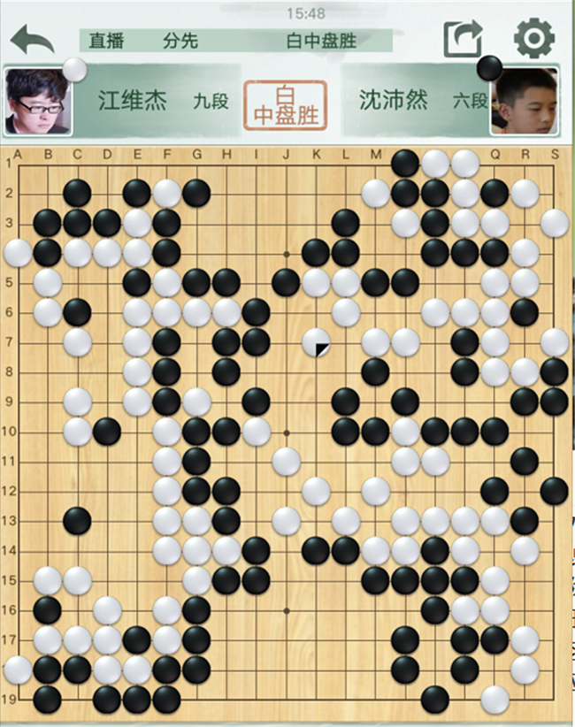 第四臺,沈沛然執(zhí)黑對陣世界冠軍江維杰。黑開局不利,右下角65緩手導(dǎo)致差距拉大。