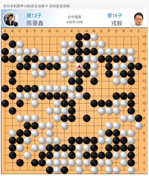 第一臺,快棋,戎毅執(zhí)白勝陳豪鑫。黑棋開局在右邊以及中盤在左上的下法略嫌松緩,白領(lǐng)先。之后黑棋沖擊白棋中央致使左邊形成打劫,白棋簡明處理后以較大優(yōu)勢進入官子。最后黑棋為了強撐一目棋在自己空里出現(xiàn)打劫,在黑棋需要找很損的劫材時候黑方認(rèn)輸。