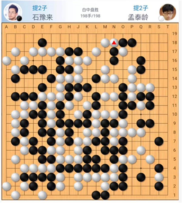 主將臺由深圳隊世界冠軍時越九段執(zhí)白對陣小將王世一五段。中盤戰(zhàn)斗中黑棋連續(xù)下出緩手,白棋取得領(lǐng)先。中央定型白棋又出現(xiàn)小失誤,局面接近。官子階段雙方錯進(jìn)錯出,局面一度來回波動。最終還是白棋后半盤功力略勝一籌,獲得些許便宜后以明顯優(yōu)勢獲勝,時越執(zhí)白中盤勝王世一。