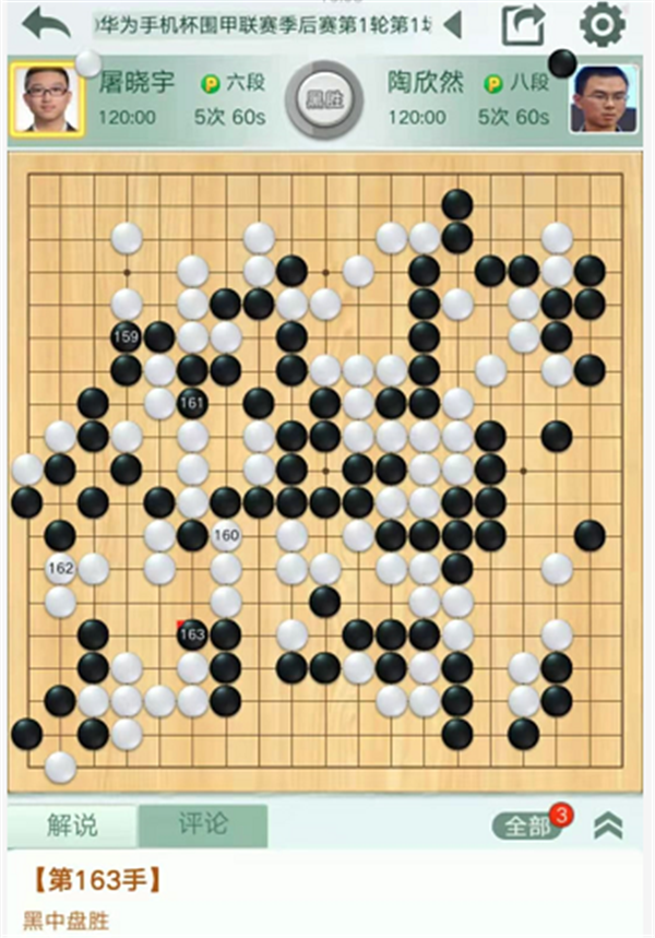 第四臺慢棋,由深圳隊陶欣然八段執(zhí)黑對陣民生隊的屠曉宇六段。開局雙方互圍大模樣。白棋右邊在黑空試應(yīng)手時黑方強烈反擊。白棋沒有下出做活的手段,不得不付出很大代價出頭跑出,黑優(yōu)勢。之后中央白棋混戰(zhàn)中戰(zhàn)略方向錯誤,黑棋優(yōu)勢擴大。最后黑棋在左邊白棋空里薄弱處出棋,一舉獲勝。陶欣然執(zhí)黑中盤勝屠曉宇。