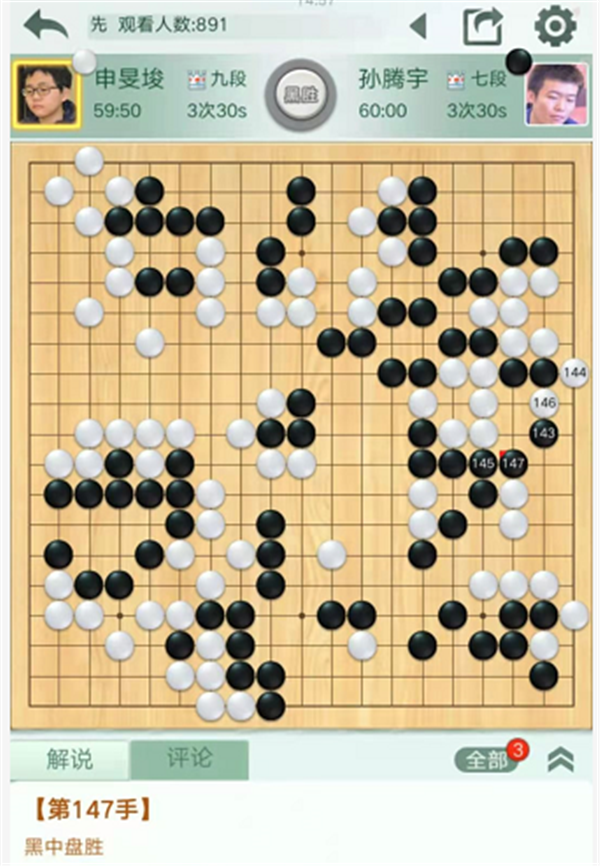 第一臺快棋,由深圳隊外援申旻埈九段執(zhí)白對陣民生隊的孫騰宇七段。白棋開局順暢,中盤下邊雙方小有失誤,依然白棋領(lǐng)先。之后白棋良好的掌握局面,優(yōu)勢擴大。進(jìn)入官子,白棋沒有補掉隱患,進(jìn)入中央破黑空時較為沖動,選點失誤造成虧損。最后被黑右邊進(jìn)入白空后反殺白棋,申旻埈執(zhí)白中盤負(fù)孫騰宇。