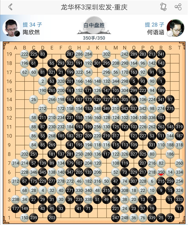 三臺陶欣然執(zhí)黑對陣小將何語涵,局面一直糾結,官子階段有所失誤,最終白棋獲勝。四臺小將石豫來執(zhí)白對陣小將李翔宇,白棋進入小官子時候局勢領先,可惜下出了一個小勺子,被黑抓住機會形成小轉換便宜了幾目棋。最終白棋以3/4子差距落敗。