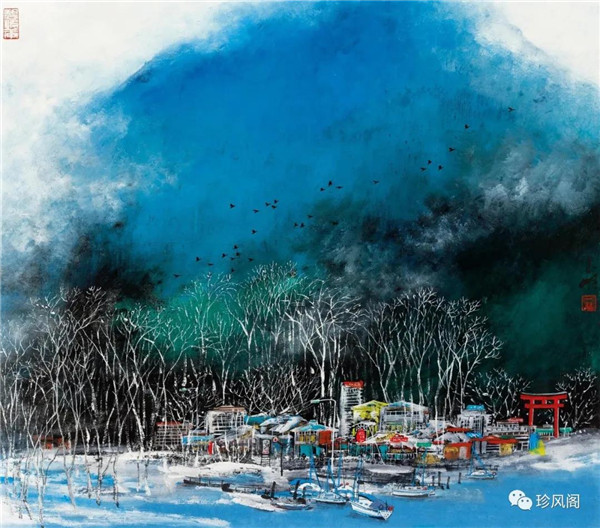 宋玉明從金陵畫派的新傳統(tǒng)跨越到城市表現(xiàn)的積彩拓墨畫法,既體現(xiàn)了現(xiàn)代化城市對于變革傳統(tǒng)的時(shí)代訴求,也體現(xiàn)了他移居深圳后這座新興城市文化對于他的深刻影響。畢竟,連續(xù)數(shù)屆的深圳水墨雙年展對于水墨在跨文化中重要作用與表現(xiàn)方法的突破,都給予他至深的思想開拓。這表明,城市山水畫已不單純是用中國畫表現(xiàn)城市的命題,而是其中能夠蘊(yùn)含多少城市文化觀念與城市審美的方法,宋玉明對于城市山水畫的探索,體現(xiàn)的正是這樣一種對城市現(xiàn)代文化的思想融合性。而不拘謹(jǐn)于城市一磚一石、一街一道、一房一樓的描繪,著眼于發(fā)揮水墨與彩墨表現(xiàn)的自由性,抑或體現(xiàn)了人性、自然與現(xiàn)代城市共同作用的現(xiàn)代生活方式與人文理想。的確,純粹用中國畫或水墨畫來探索城市的現(xiàn)代化景觀表現(xiàn),也許只是淺層次的審美需求;而只有當(dāng)把山水畫作為人與自然和諧統(tǒng)一的觀念表達(dá)植入城市現(xiàn)代化的審美訴求時(shí),城市山水畫才能真正凸顯出其深刻的美學(xué)價(jià)值。這正是我們從宋玉明的作品里能夠讀解到的他對于城市山水畫審美理想的一種勾畫。