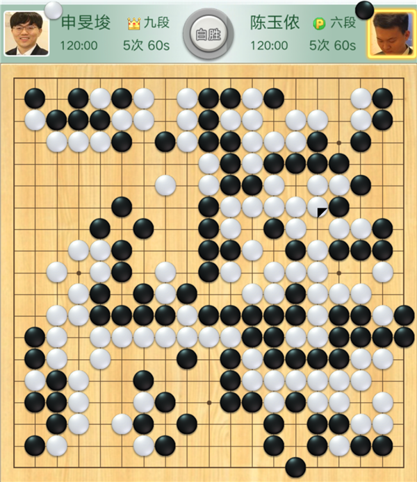 本輪比賽,率先破局取勝的是二臺(tái)外援主將申旻埈。是局,申旻俊執(zhí)白對陣三連勝的小將陳玉儂。黑棋開局沖擊右下白棋急躁,白棋處理好后局面大幅領(lǐng)先。黑棋之后在左邊與上邊奮力拼搏,白棋冷靜應(yīng)對,輕松獲勝。行棋204手。
