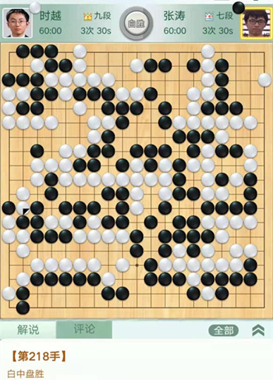 時越快棋執(zhí)白對陣張濤。右邊作戰(zhàn)時候,黑棋沒有選擇造劫劫爭而是退讓,被白將右邊幾子吃掉后又吃掉右上黑棋,黑棋局面落后。之后黑棋右下又死活看錯被白先手活出,導致雪上加霜,實際上棋局已經結束。