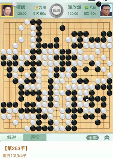 陶欣然執(zhí)黑對陣檀嘯。中盤白棋在右邊下出緩手,導致攻守逆轉,白棋被迫做劫求活。黑棋利用劫爭中央連走兩手獲利巨大。之后黑棋穩(wěn)健收官將優(yōu)勢保持至終局。
