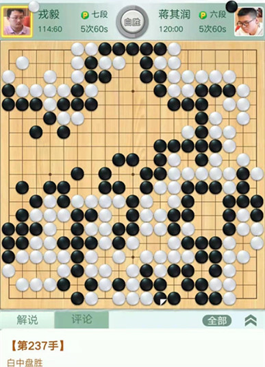 戎毅執(zhí)白對陣蔣其潤。開局白取地中央黑模樣巨大,白淺消后黑棋攻擊不當,被白活出兩塊棋后白棋領先。之后黑棋左下棄子圍空又虧損,白棋以較大優(yōu)勢獲得勝利。