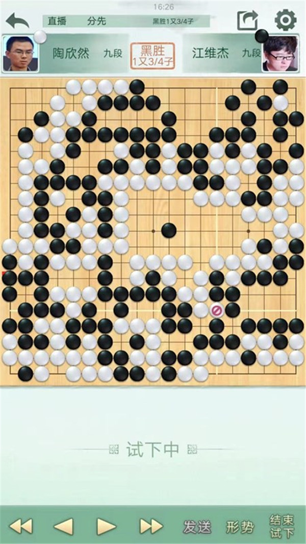 二臺陶欣然執(zhí)白主將對陣世界冠軍江維杰。開局白有利,左邊白棋進攻黑棋時候手法過于松緩,局面接近。之后白棋中央又出現(xiàn)緩手黑棋領先。之后右上白棋主動開劫,但是劫材處理失誤,局面惡化。之后黑棋稍有退讓保持小勝。