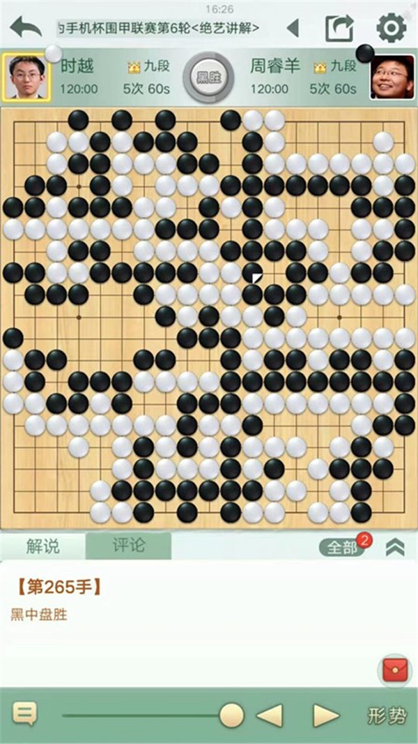 四臺時越執(zhí)白對陣世界冠軍周睿羊。中盤白棋侵消黑棋左上大模樣,黑棋付出很大代價強殺形成打劫。白棋劫爭中不夠細膩沒有擴大戰(zhàn)果而是聯(lián)絡成活,局面白稍有利。之后白棋左下連續(xù)下出緩手后局面接近。右下角黑棋二路夾試白應手時白棋嚴重失誤,被黑棋奪走角地后局勢逆轉。