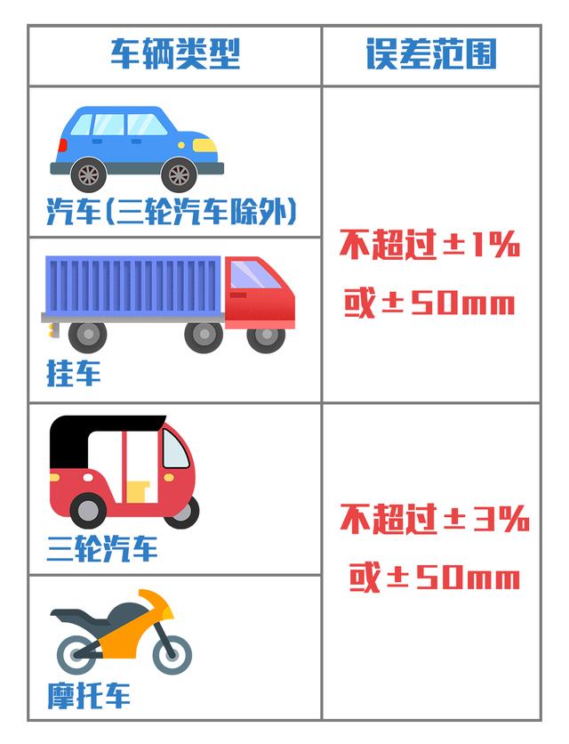 注冊登記安全檢驗時,機動車外廓尺寸實測值不應超出GB7258、GB1589規(guī)定的限值,且與機動車產品公告,機動車出廠合格證記載的數(shù)值相比,誤差應滿足: