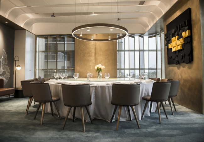 以黑色和金色為主色調(diào)的梧桐PLUS,選用流動(dòng)的線條對餐廳空間進(jìn)行分割。桌與桌之間的距離保證了食客對話的私密性和安全性。即使沒有預(yù)定到包廂,也不用擔(dān)心旁邊食客的閑聊會(huì)影響到彼此。