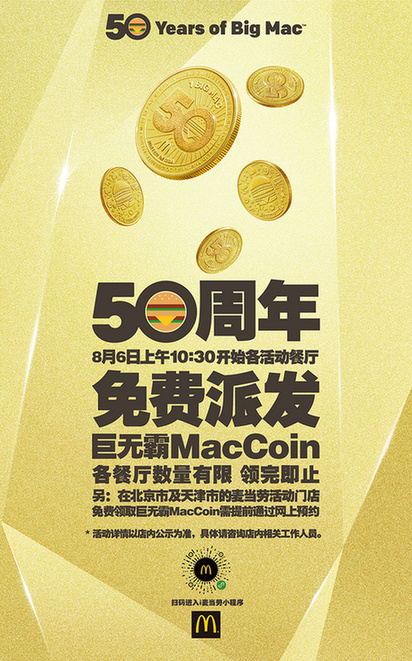 為了與中國消費者一起歡慶巨無霸50周年,中國內(nèi)地指定麥當勞餐廳將于2018年8月6日當日免費送出超過100萬枚MacCoin。早上10:30開始,顧客前往餐廳為巨無霸唱出生日歌[ 北京市和天津市的顧客需2018年8月4日上午9:00起在“i麥當勞”微信小程序提前預(yù)約,方可于8月6日10:30起在指定麥當勞餐廳領(lǐng)取。],即可獲得MacCoin一枚,圖案隨機,送完即止。北京市和天津市的顧客需2018年8月4日上午9:00起在“i麥當勞”微信小程序提前預(yù)約,方可于8月6日10:30起在指定麥當勞餐廳領(lǐng)取。顧客可以分享與收藏,也可以在2018年12月31日前憑MacCoin在中國內(nèi)地、美國、荷蘭、新西蘭、巴西等全球超過50個國家和地區(qū)參與活動的麥當勞餐廳,免費兌換巨無霸一個。