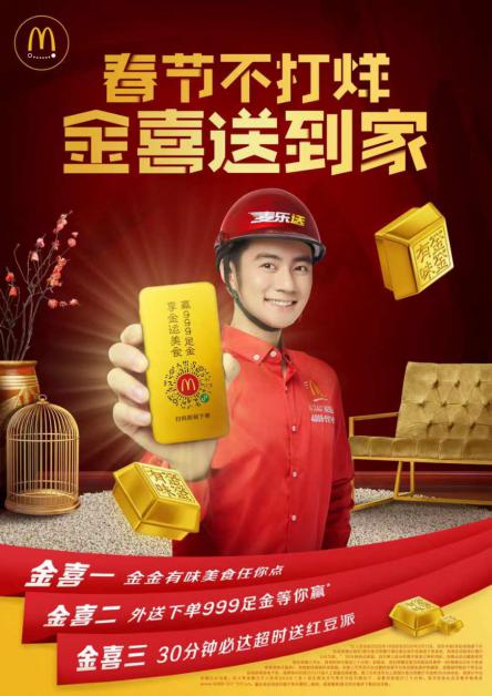 麥當(dāng)勞外送服務(wù)麥樂送在春節(jié)期間也加入“金金”有味的體驗(yàn),為餐廳以外的顧客送出三重“金”喜:全系列新品登陸麥樂送平臺(tái),通過麥當(dāng)勞官方渠道和第三方訂餐平臺(tái)都可以下單;麥樂送下單也可以參與抽獎(jiǎng),贏取周大福足金;春節(jié)期間美食30分鐘必達(dá),超時(shí)將贈(zèng)送紅豆派。
