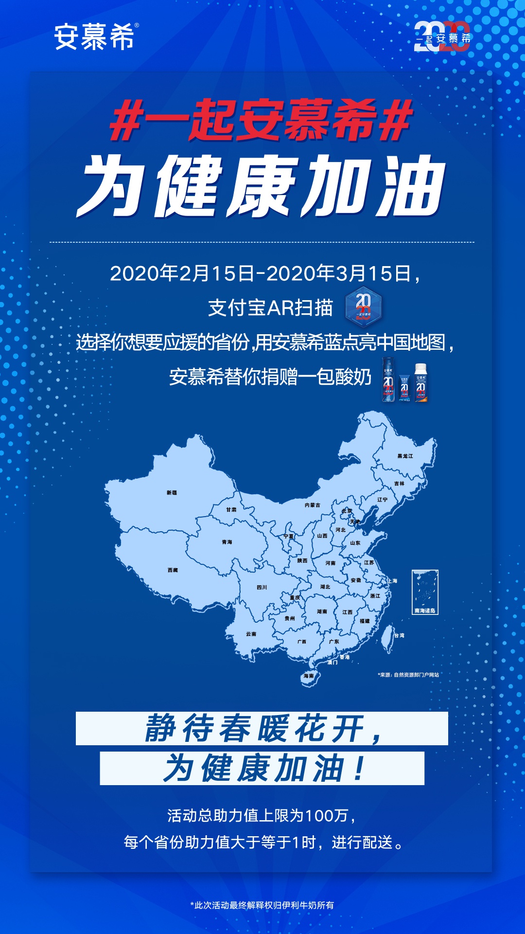 從2月15日起,安慕希發(fā)起“一起為健康加油”公益活動(dòng)。消費(fèi)者每成功通過(guò)支付寶AR掃描安慕希2020標(biāo)志,并為支持的地區(qū)點(diǎn)藍(lán),安慕希就會(huì)為抗疫一線人員送出安慕希產(chǎn)品,將愛(ài)心化為實(shí)際行動(dòng),為戰(zhàn)疫一線加油。