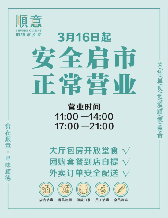為了保證消費(fèi)者和員工的健康,順意順德家鄉(xiāng)菜做足的準(zhǔn)備工作,聘請了專業(yè)公司對全店進(jìn)行專業(yè)消毒凈化,每個(gè)員工上崗前均進(jìn)行測量體溫、深度清潔雙手等措施,服務(wù)員在服務(wù)時(shí)也秉承無接觸的原則,傳菜加蓋隔離、餐具高溫消毒、到店測溫、安心送等種種服務(wù)讓消費(fèi)者感到安心。