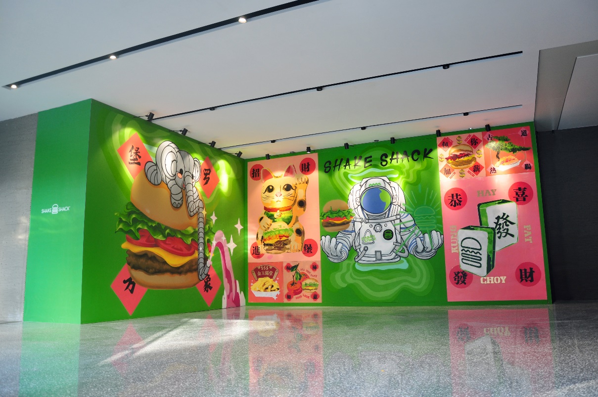 圍擋的室內(nèi)部分采用創(chuàng)新的互動形式,由藝術(shù)家現(xiàn)場親自手繪完成的8幅單元涂鴉畫板組合而成。藝術(shù)家用摩登時(shí)尚的波譜藝術(shù),向當(dāng)?shù)刭e客們奉送出中國傳統(tǒng)的祝福及Shake Shack的活力熱情。
