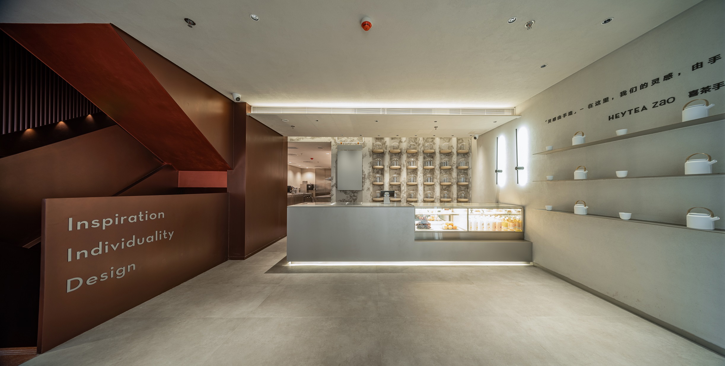 在內(nèi)部設(shè)計上,喜茶同樣以創(chuàng)新的功能空間設(shè)置和突破性設(shè)計,呼應(yīng)每一樓層的手造主題,升級了消費者的空間體驗。喜茶將一樓正門墻體改造為玻璃移門,塑造出通透的門店空間;變封閉窗戶為開放的門,讓顧客看得見手造產(chǎn)品的全過程。此外,在用色與材質(zhì)搭配上,門店內(nèi)部整體采用嶺南復(fù)古紅與現(xiàn)代極簡白搭配,做舊復(fù)古肌理漆與現(xiàn)代化金屬材質(zhì)呼應(yīng),不僅有效進(jìn)行功能分區(qū),還體現(xiàn)歷史感與現(xiàn)代感的對比、融合。