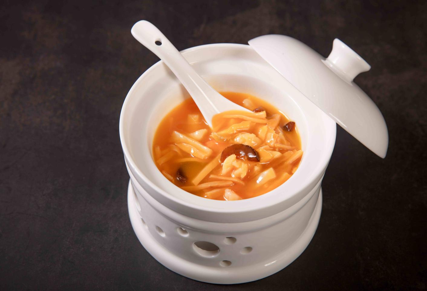 蟹粉?;矢赫邕x多種海洋珍饈,肉厚品佳的海參,軟嫩滑爽的鮮鮑,白如玉簪的白靈菇,在蟹粉濃湯的渲染下,一湯匙入口,滿(mǎn)滿(mǎn)都是精華;
