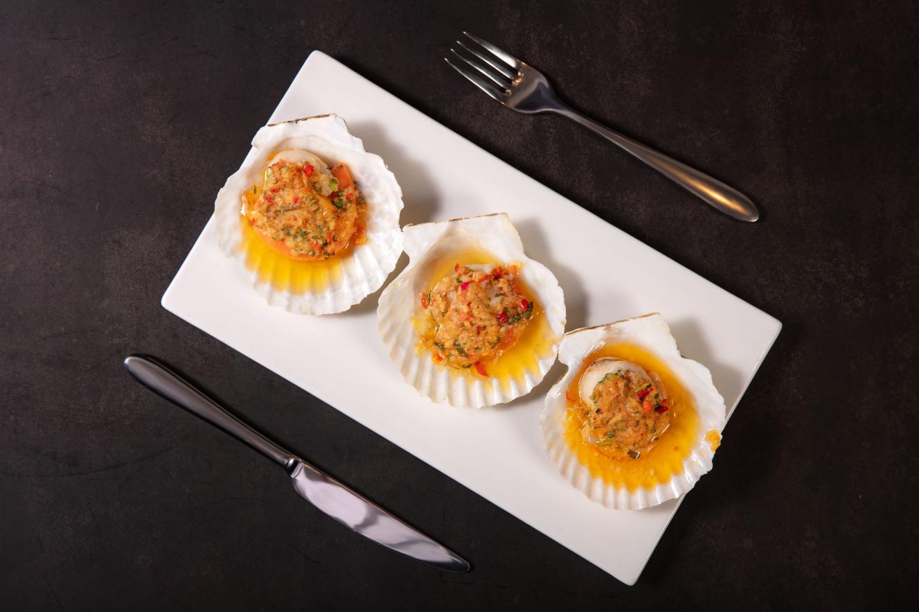 蟹粉烤元貝:雪白無(wú)瑕,口舌生香的元貝,伴隨著蟹粉的噴香,鮮上加鮮;