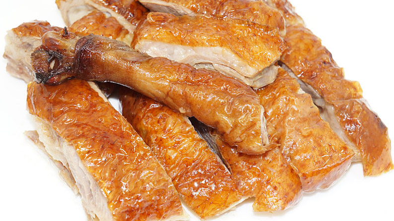 燒鵝外表金黃鮮亮,香氣濃郁,皮香脆可口,肉汁中帶有韌性,在舌尖上流淌。