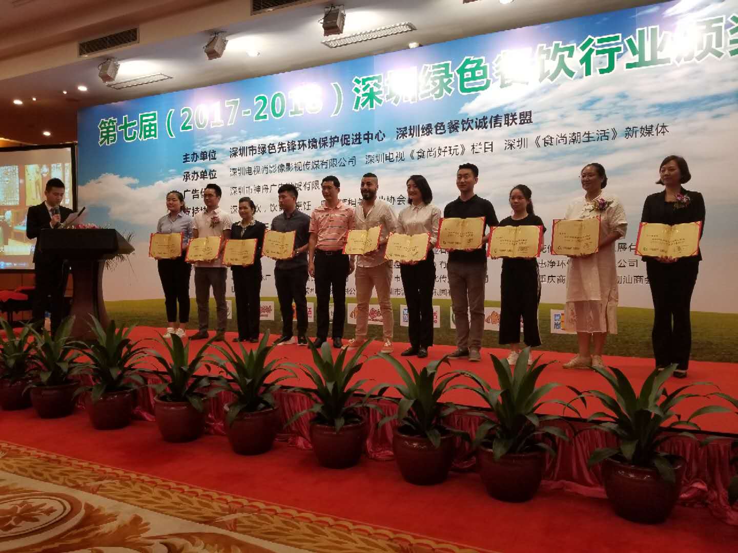 9月19日,第七屆深圳綠色餐飲行業(yè)頒獎(jiǎng)典禮在深圳市五洲賓館舉行,共有四十家餐飲企業(yè)分別獲得深圳綠色餐飲十大特色優(yōu)秀名店獎(jiǎng)、深圳綠色餐飲十佳綠色誠信企業(yè)獎(jiǎng)、深圳綠色餐飲十強(qiáng)連鎖品牌企業(yè)獎(jiǎng)、深圳綠色餐飲特受歡迎時(shí)尚餐廳獎(jiǎng),十位餐飲行業(yè)杰出代表獲得深圳綠色餐飲十佳人物貢獻(xiàn)獎(jiǎng)。