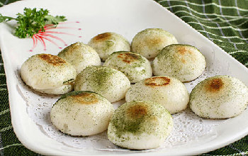 發(fā)酵好后,將綠面團(tuán)分劑搟成圓皮,白面團(tuán)分劑揉成小圓球,綠皮對折后在中間挖去一小部分,展開后放入三個豆子,邊緣捏緊,上鍋蒸熟。