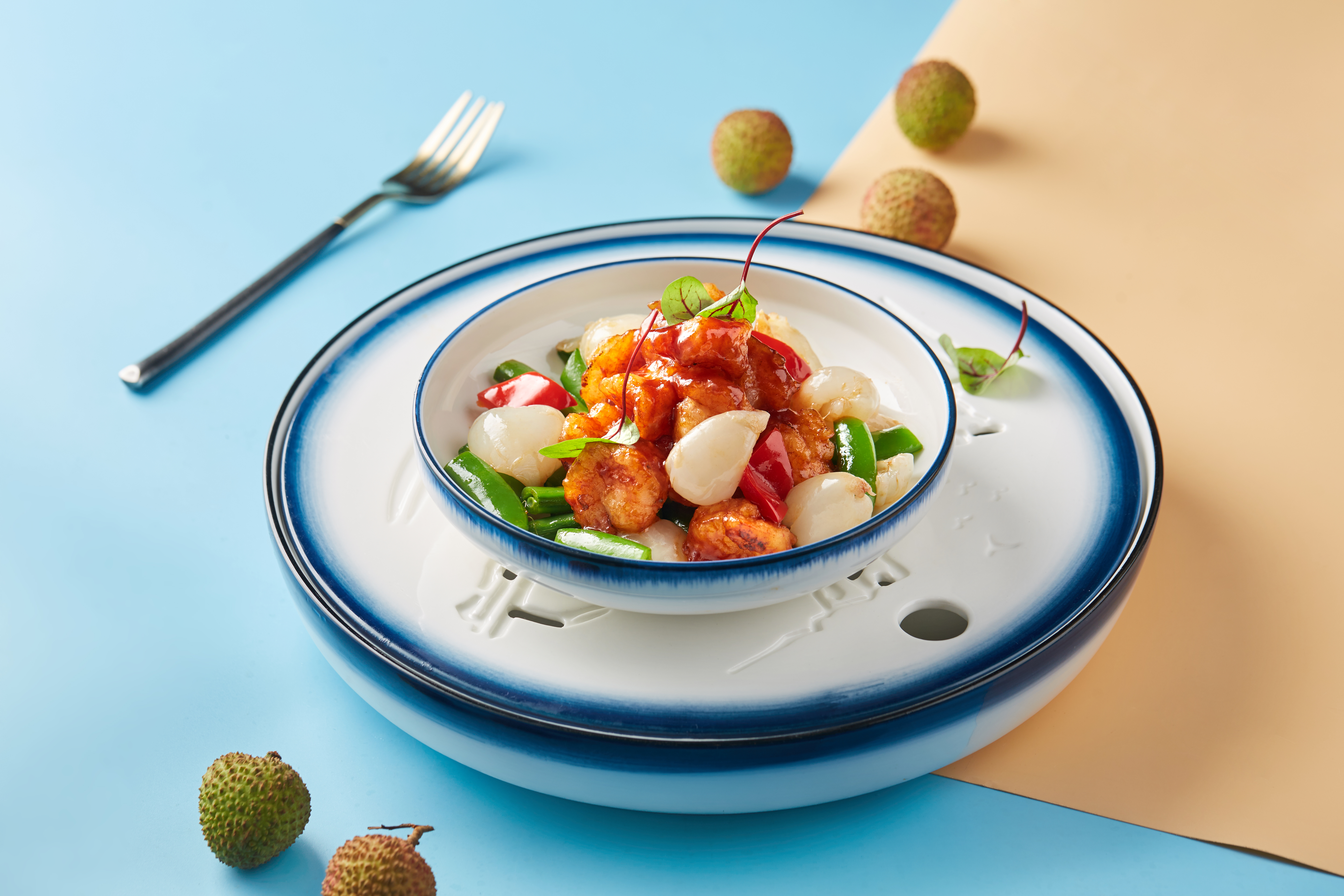 粵菜師傅延續(xù)舊日食風(fēng),巧妙設(shè)計(jì),將荔枝肉與蝦仁共燴-碧綠蝦仁炒荔枝肉.