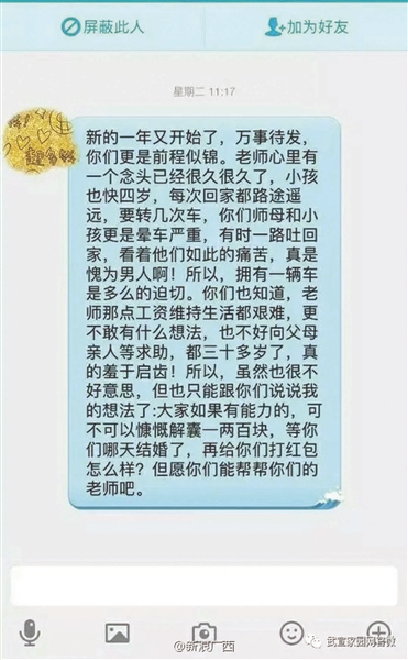 爆料帖中同時(shí)上傳了多張聊天記錄,其中一張顯示:“新的一年又開(kāi)始了,萬(wàn)事待發(fā),你們更是前程似錦。老師心里有個(gè)念頭已經(jīng)很久了,小孩也快四歲了,每次回家都路途遙遠(yuǎn),要轉(zhuǎn)幾次車(chē),你們師母和小孩更是暈車(chē)嚴(yán)重,有時(shí)一路吐回家,看看他們?nèi)绱送纯?,真是愧為男人?。∷?,擁有一輛車(chē)是多么的迫切。你們也知道老師那些工資維持生活都很艱難,更不敢有什么想法,也不好向父母親人求助,都三十多歲了,真的羞于啟齒!所以,雖然也很不好意思,但是也只能跟你們說(shuō)說(shuō)我的想法了:大家如果有能力的,可不可以慷慨解囊一兩百塊,等你們哪天結(jié)婚了,再給你們打紅包怎么樣?但愿你們能幫幫你們的老師吧?!?/p>