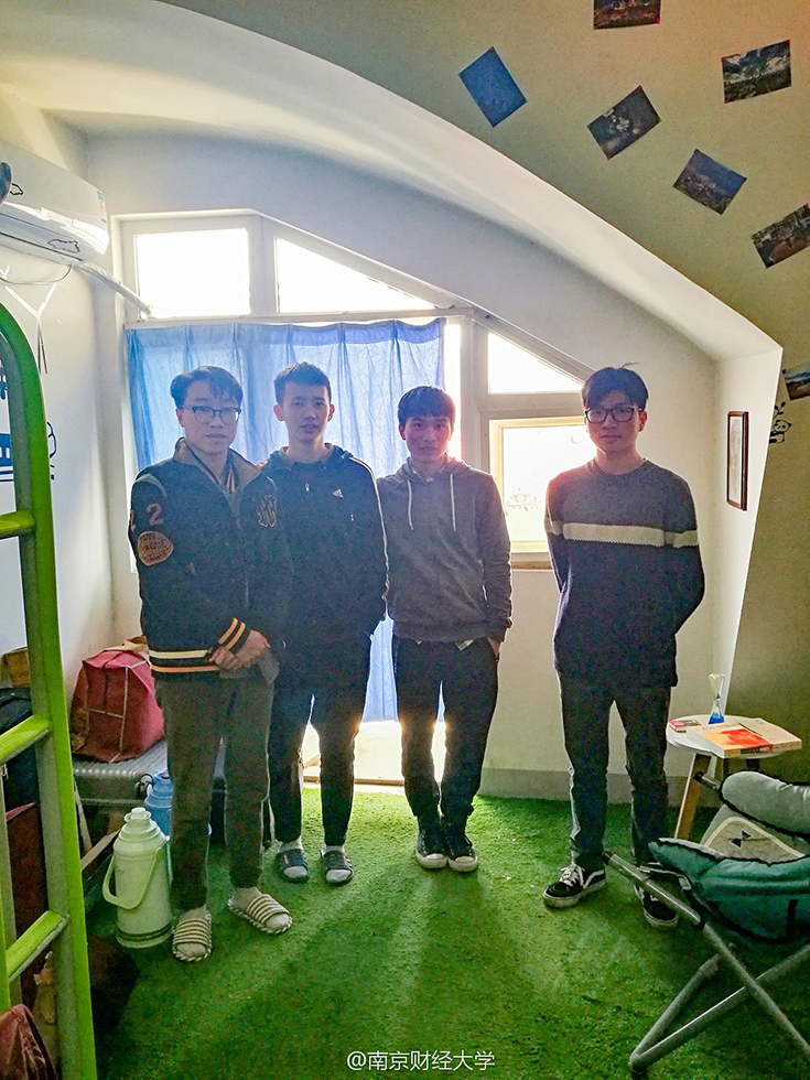 綿綿的草坪、充滿設(shè)計感的書架、掛著素描畫的墻……難以想象這是四個19歲男生的寢室。南京財經(jīng)大學(xué)西苑9幢男生宿舍頂樓602寢室,住著4位“世外高人”—— 涂貴平、柯毅、劉以康和廉鎮(zhèn)宇,他們用事實告訴大家,男生宿舍文藝起來,可絲毫不輸女生。