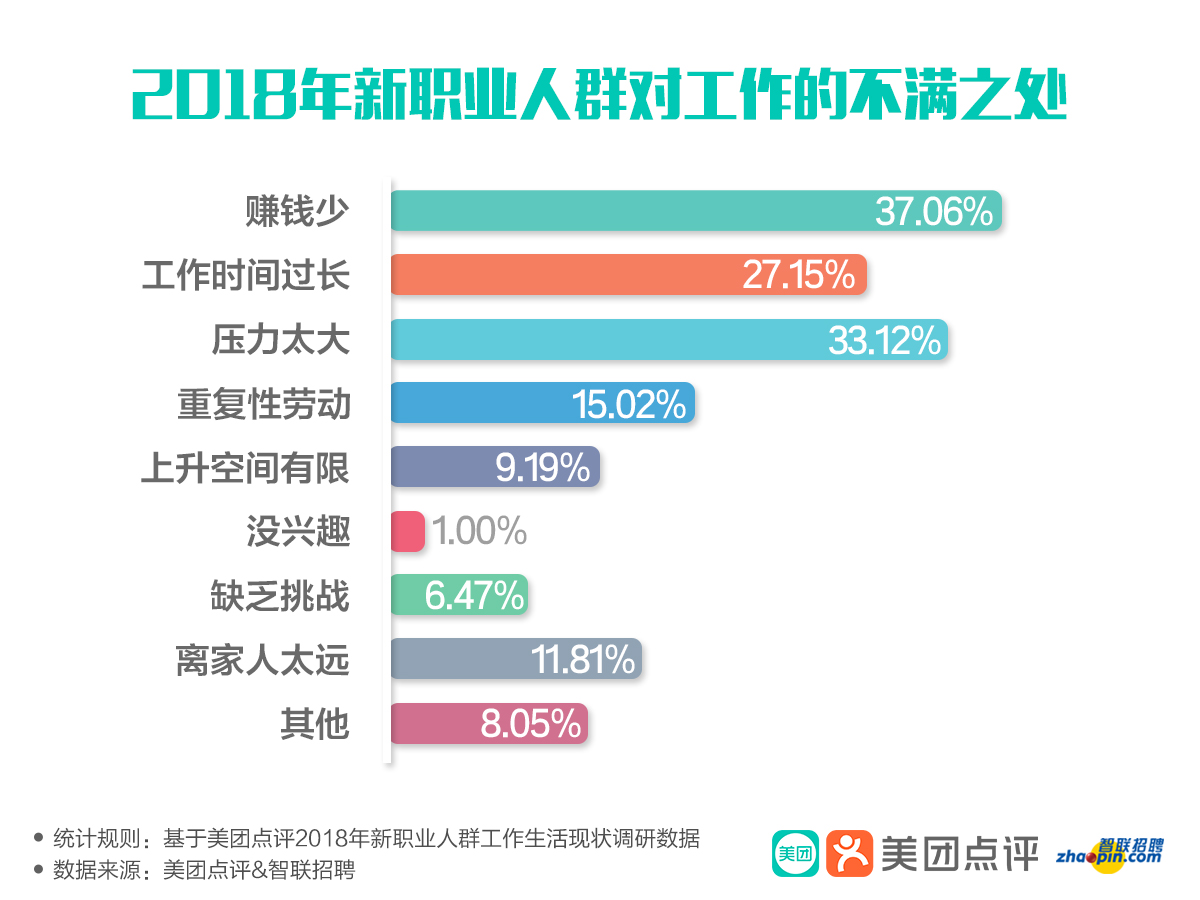 盡管新職業(yè)人群因?yàn)椤跋矚g這個(gè)行業(yè)和職業(yè)”而加入,但對(duì)更高薪資待遇的追求,與白領(lǐng)是一致的。談及對(duì)工作的不滿(mǎn)之處,盡管他們對(duì)工作有一些抱怨,在此項(xiàng)調(diào)研上有多重表達(dá),但最大的不滿(mǎn)還是直指薪酬水平。報(bào)告發(fā)現(xiàn),被新職業(yè)人群認(rèn)為對(duì)工作不滿(mǎn)的前三大原因是:賺錢(qián)少、壓力太大、工作時(shí)間太長(zhǎng)。