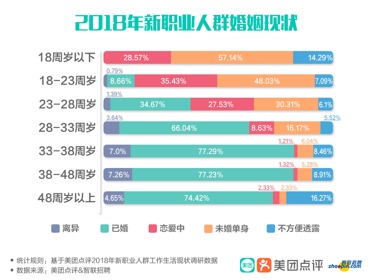 據(jù)《人民日?qǐng)?bào)》報(bào)道,近30年來(lái),年輕人晚婚的現(xiàn)象越來(lái)越明顯。在新職業(yè)人群中,婚姻狀態(tài)也符合了這一社會(huì)趨勢(shì)。數(shù)據(jù)顯示,在新職業(yè)人群中,僅僅有34.67%的90后(23-28周歲)已經(jīng)結(jié)婚,85后(28-33周歲)的已婚率則達(dá)到了66.04%,到了80后(33-38周歲),已婚率提高到了77.29%,這個(gè)數(shù)據(jù)符合大眾的普遍認(rèn)知。