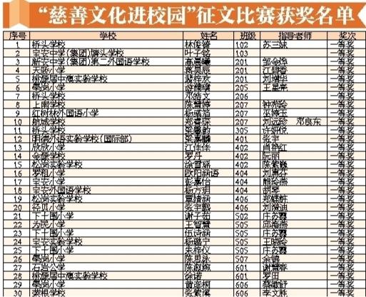 寶安日報(bào)2020年1月2日訊 2019年12月31日下午,寶安區(qū)慈善文化進(jìn)校園征文比賽表彰暨2019年度工作總結(jié)會在寶安實(shí)驗(yàn)學(xué)校會議室舉行。會上對征文比賽獲獎(jiǎng)?wù)吆蛢?yōu)秀組織單位進(jìn)行表彰。學(xué)生代表分享慈善故事,學(xué)校代表則分享慈善文化進(jìn)校園經(jīng)驗(yàn)。此次慈善文化進(jìn)校園征文活動(dòng)是由區(qū)教育局、區(qū)慈善會、寶安日報(bào)社、寶安廣電中心共同主辦,征文主題是“慈善在我身邊”,活動(dòng)在全區(qū)中小學(xué)生中進(jìn)行征集。經(jīng)過兩個(gè)月的征集和評比,最終評出3個(gè)組別的一、二、三等獎(jiǎng)和優(yōu)秀組織單位。